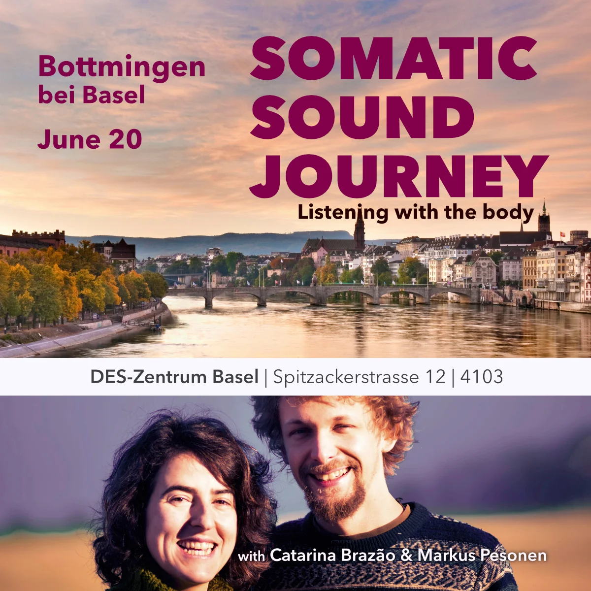 Somatic Sound Journeys wurden von der somatischen Lehrerin Catarina Brazão und dem Komponisten Markus Pesonen entworfen, mit der Absicht, durch Beobachtung und Erkundung unserer selbst in Verbindung mit den Klängen ein Gefühl für den Körper zu erlernen.